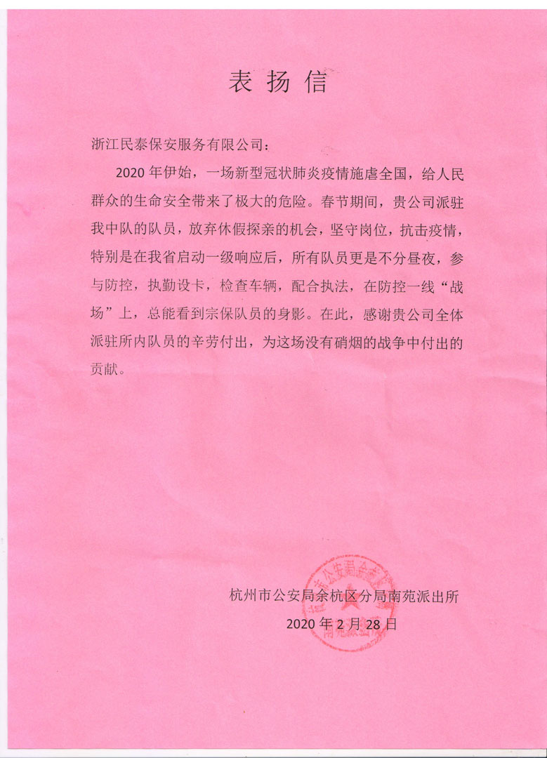 2月28日,浙江民泰公司收到杭州市公安局余杭區(qū)分局南苑派出所送來的表揚(yáng)信,贊揚(yáng)公司駐該所項(xiàng)目隊(duì)員在疫情防控中的工作表現(xiàn),感謝隊(duì)員們的辛勤付出。