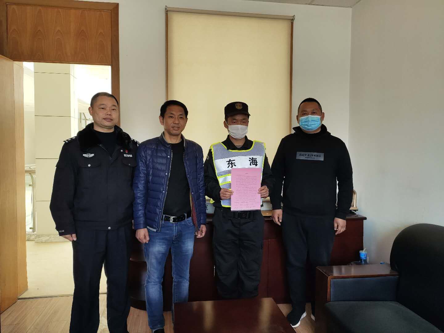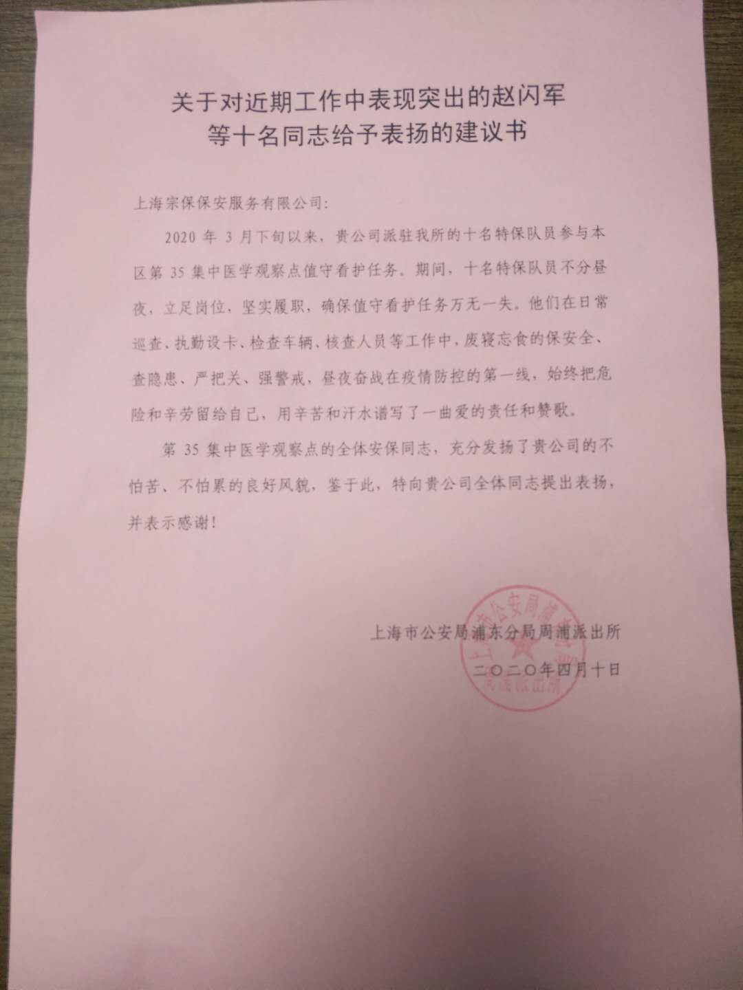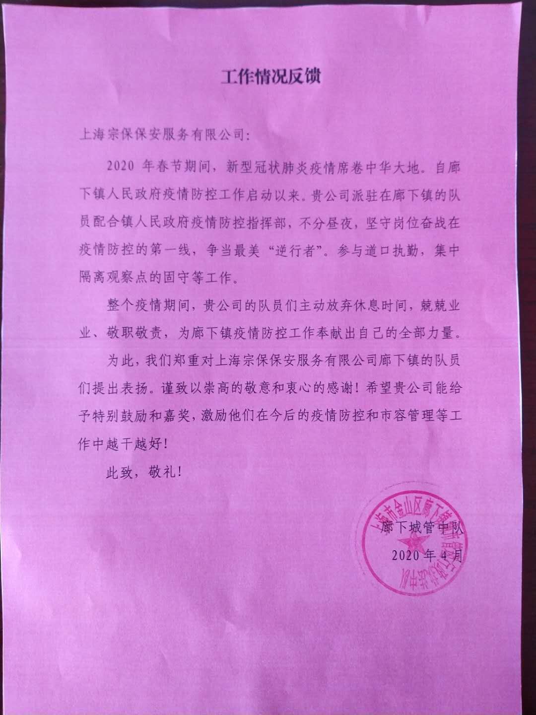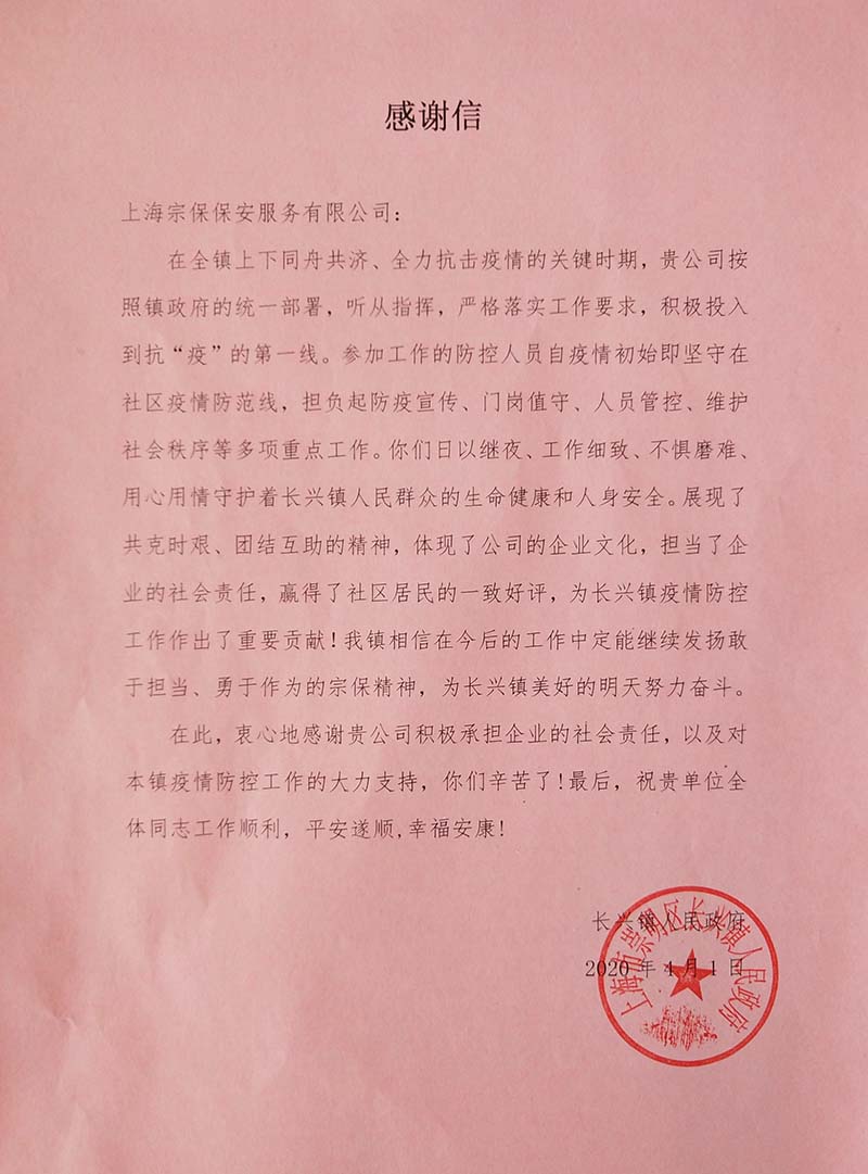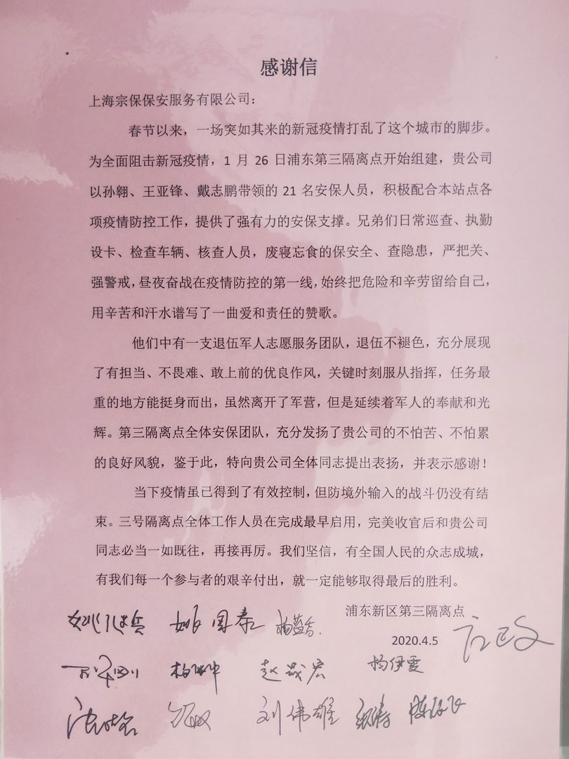 4月10日,宗保公司駐周浦輔警項(xiàng)目收到甲方的感謝信,信中對參與35號集中醫(yī)學(xué)觀察點(diǎn)的趙閃軍等10名保安員提出表揚(yáng)并表示感謝。