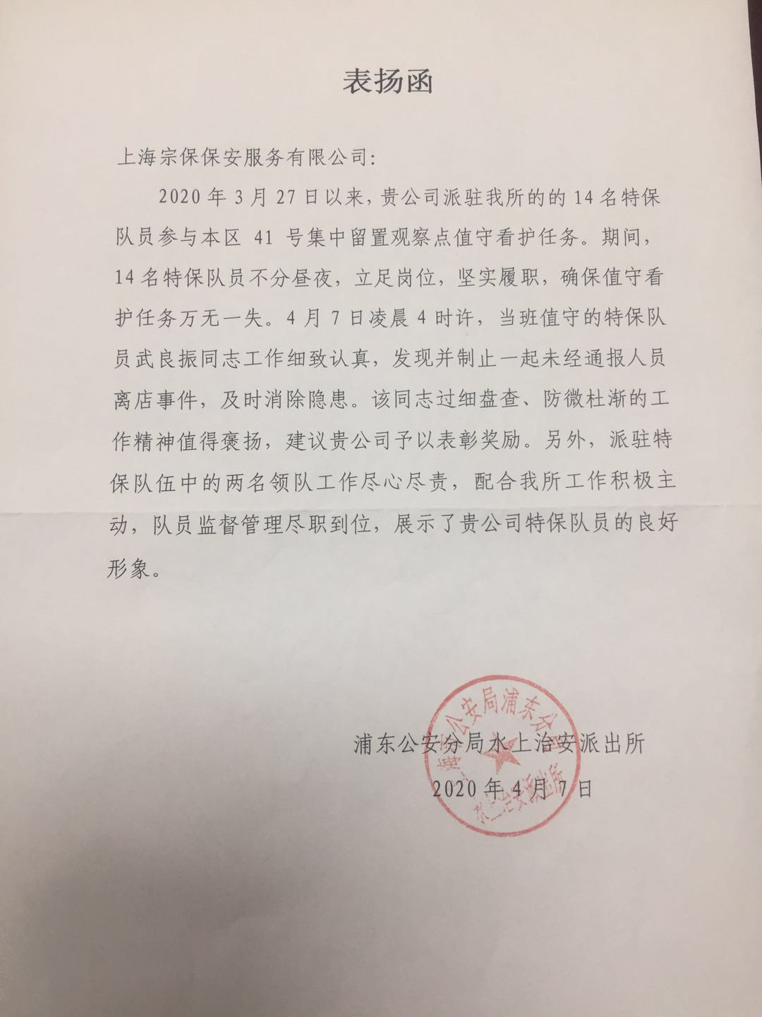 4月7日,宗保公司駐周浦輔警項(xiàng)目收到浦東新區(qū)水上治安派出所送來的表揚(yáng)函。