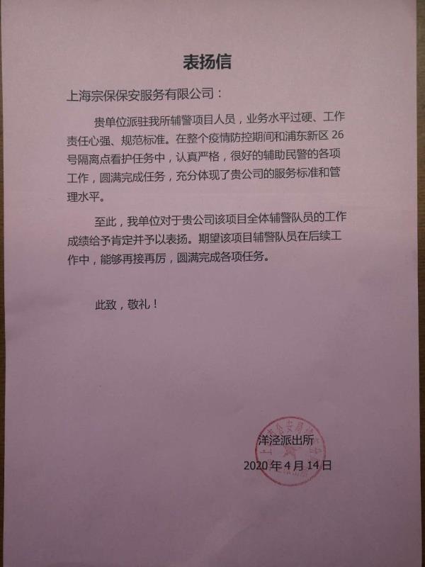 4月14日,宗保公司收到洋涇派出所送來的表揚(yáng)信。信中對公司駐該所輔警項(xiàng)目參與第26號集中隔離點(diǎn)保障工作情況給予肯定和表揚(yáng)。