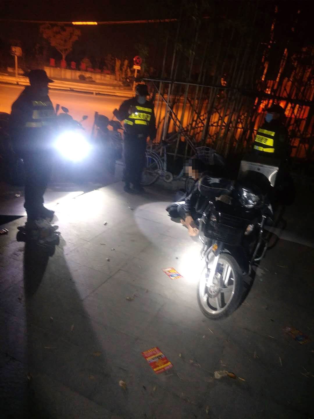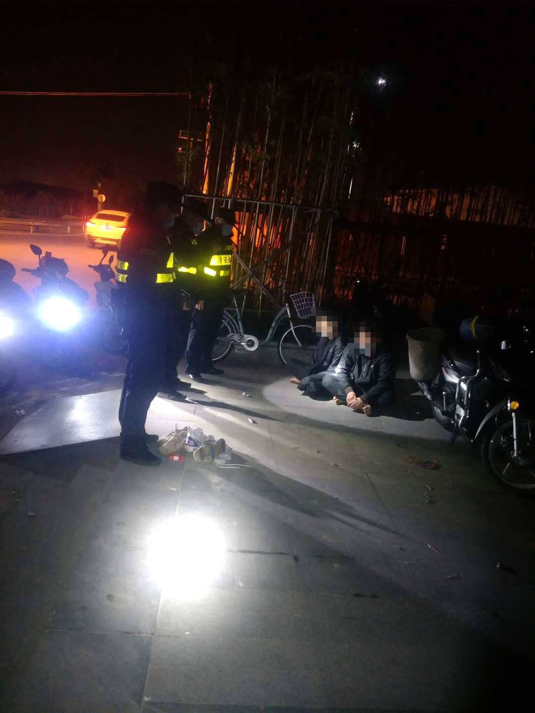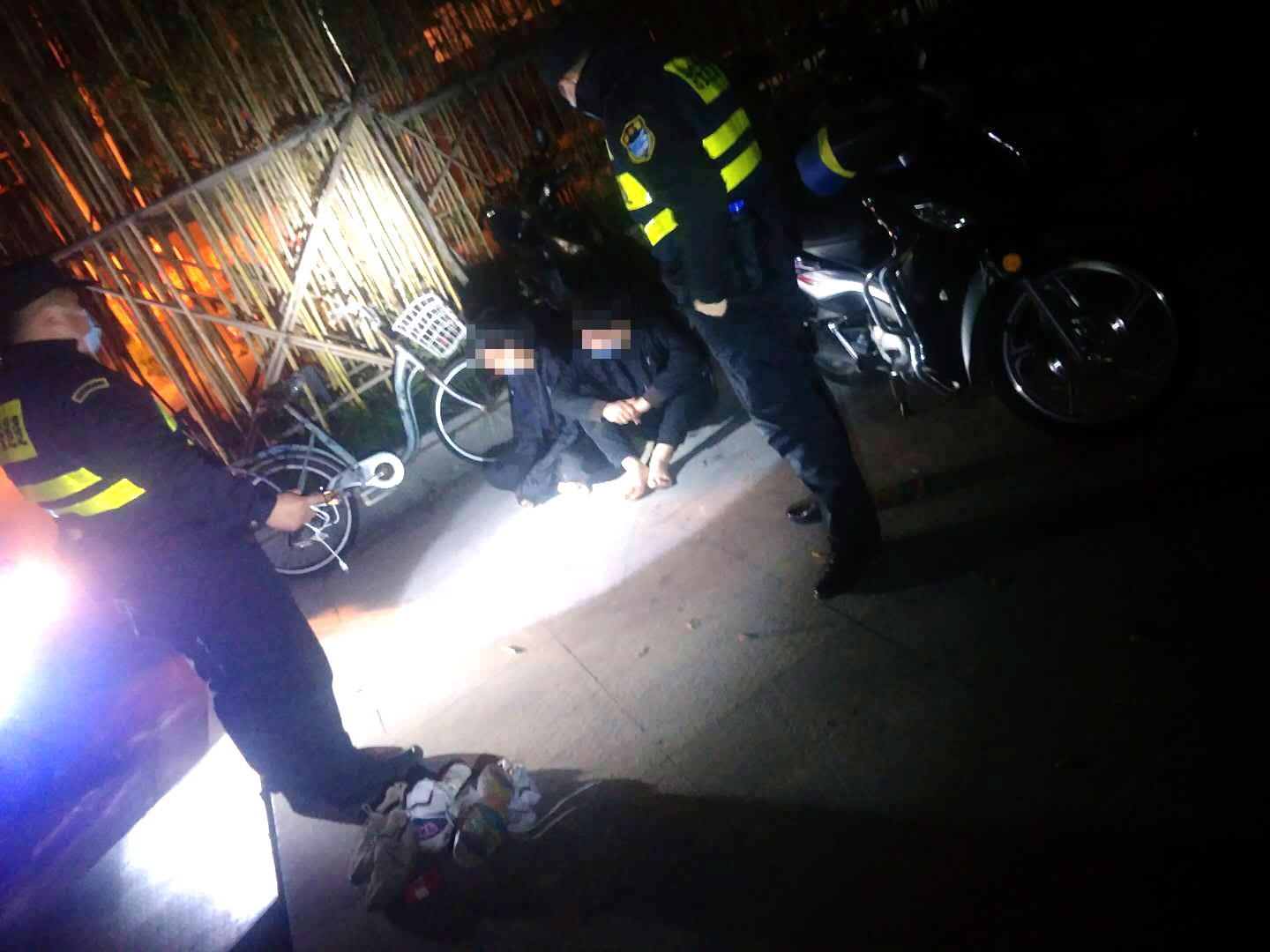 兩名保安隊員聽聞情況后,立即幫助出租車司機報警,并耐心安撫司機的情緒。就在這時,突然聽見有人踩踏鐵板的聲音,循著聲音過去,發(fā)現(xiàn)有兩個小伙子衣著不整、神思恍惚。兩個人看到身穿保安制服的隊員拔腿就跑,張紅利、郭艷宇見狀立即上前將二人控制住。