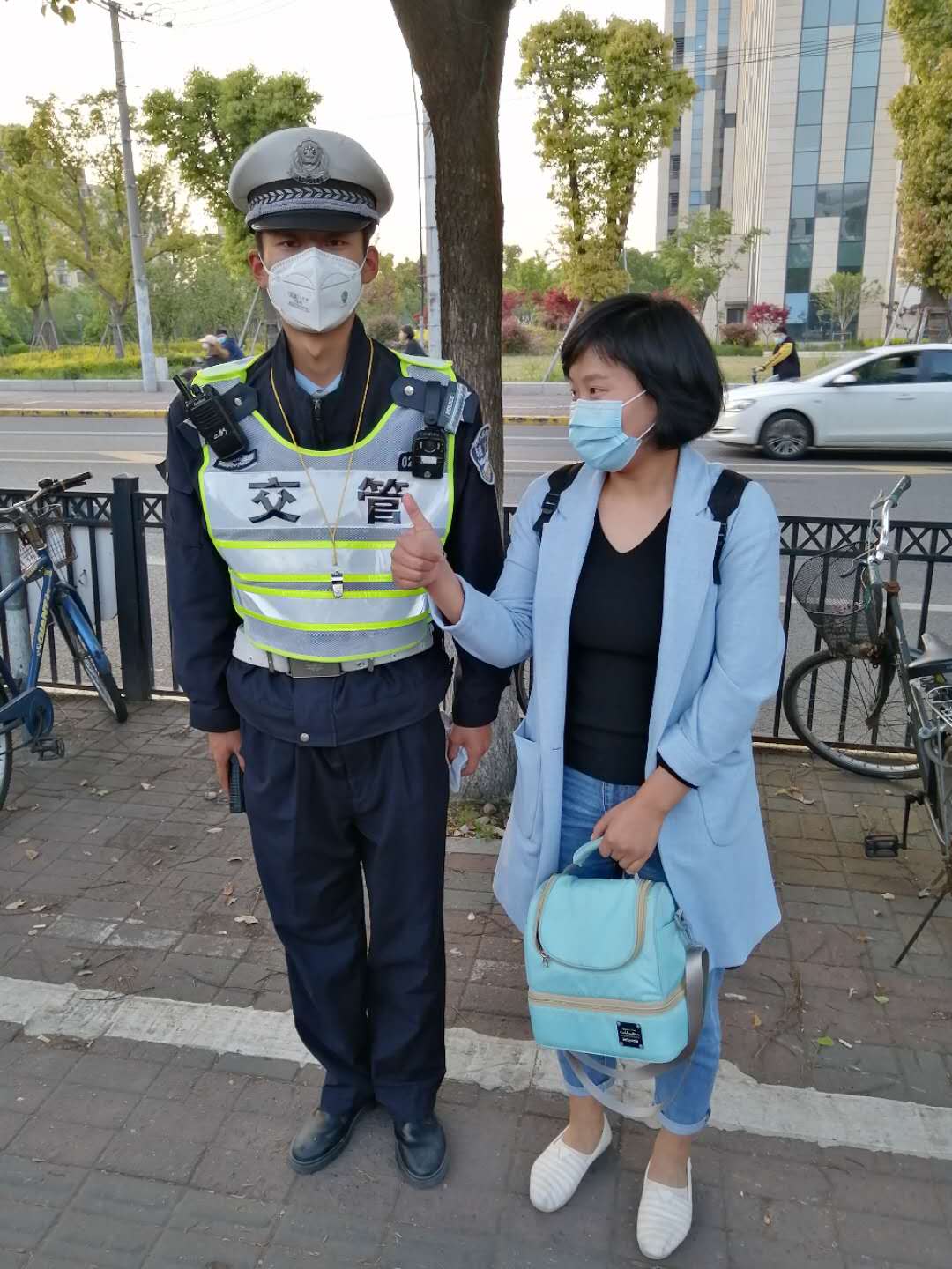 失主開心的和小閆合影,并沖小閆豎起大拇指說:“雖然包里沒有什么重要的物品,但是我們的城市有這樣盡心盡責(zé)的守護者,我們真的很安心。”