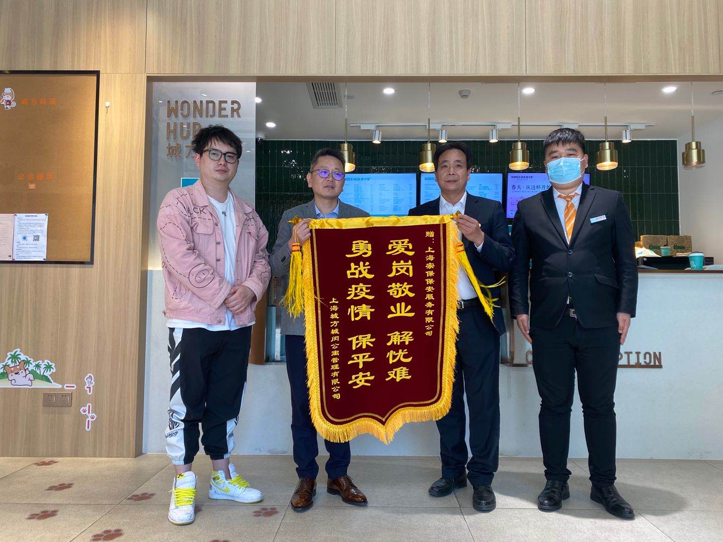 4月28日下午,上海城方城閔公寓管理有限公司總經(jīng)理金義星將一面寫(xiě)有“愛(ài)崗敬業(yè)解憂難,勇戰(zhàn)疫情保平安”的錦旗送到上海宗保保安服務(wù)有限公司王書(shū)劍經(jīng)理的手中,這面錦旗是甲方對(duì)宗保公司疫情防控工作最好的認(rèn)可和贊許。