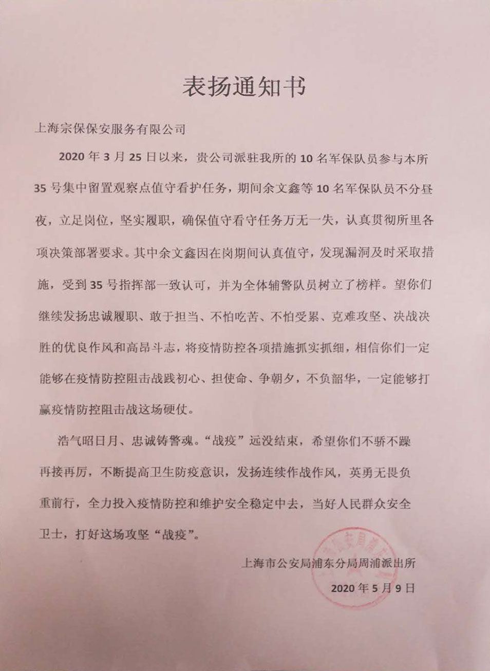 5月9日,宗保公司駐周浦派出所輔警項(xiàng)目收到周浦派出所送來的一封表揚(yáng)信,信中對(duì)在疫情防控期間參與第35號(hào)集中留置觀察點(diǎn)值守看護(hù)工作的隊(duì)員提出表揚(yáng)。