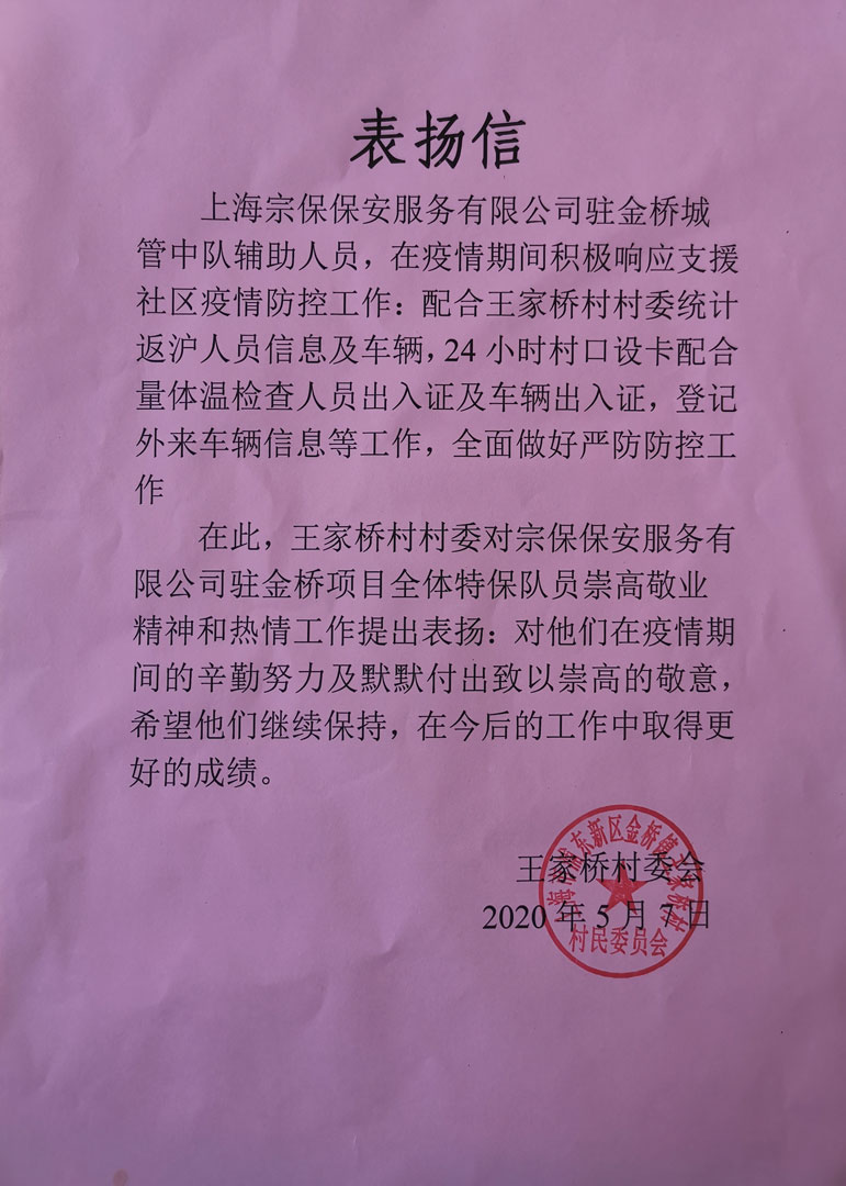 新冠肺炎疫情防控中,上海宗保保安服務(wù)有限公司駐金橋市容項(xiàng)目隊(duì)員不辭辛苦、甘愿奉獻(xiàn),配合王家橋村委會(huì)落實(shí)好各項(xiàng)疫情防控措施,為王家橋村的疫情防控工作做出了應(yīng)有貢獻(xiàn),收到了王家橋村委會(huì)送來的錦旗和感謝信。