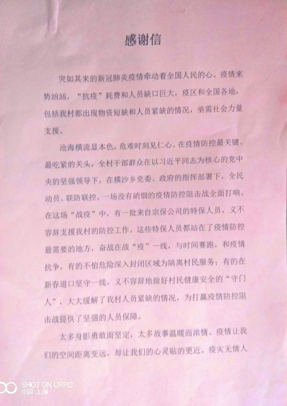 4月21日,宗保公司駐崇明橫沙市容項(xiàng)目收到民生村村委會(huì)送來的感謝信,信中對(duì)宗保公司參與民生村疫情防控的隊(duì)員們表示感謝。