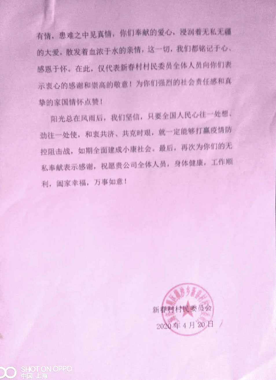 4月20日,宗保公司駐崇明橫沙市容項(xiàng)目收到橫沙鄉(xiāng)新春村村委會(huì)送來的感謝信,信中對(duì)在疫情期間支援新春村疫情防控工作的隊(duì)員們表示感謝。