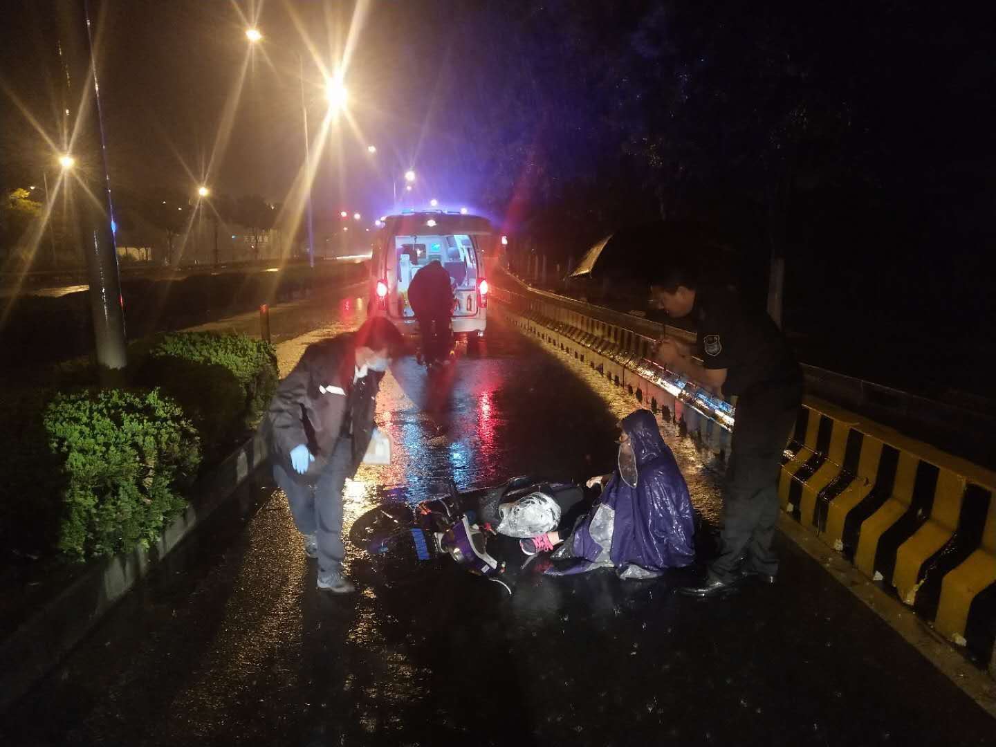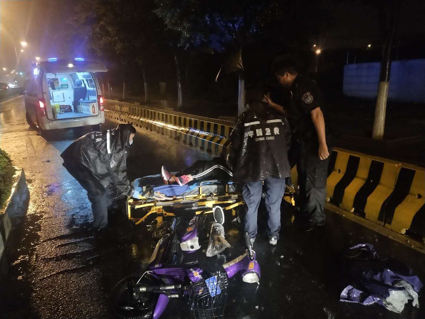 當(dāng)晚22:30,大雨傾盆,能見度較差。李杰巡邏到申江路周祝公路時(shí),發(fā)現(xiàn)一輛電瓶車摔倒在地,一名女子躺在雨水中無法動彈。