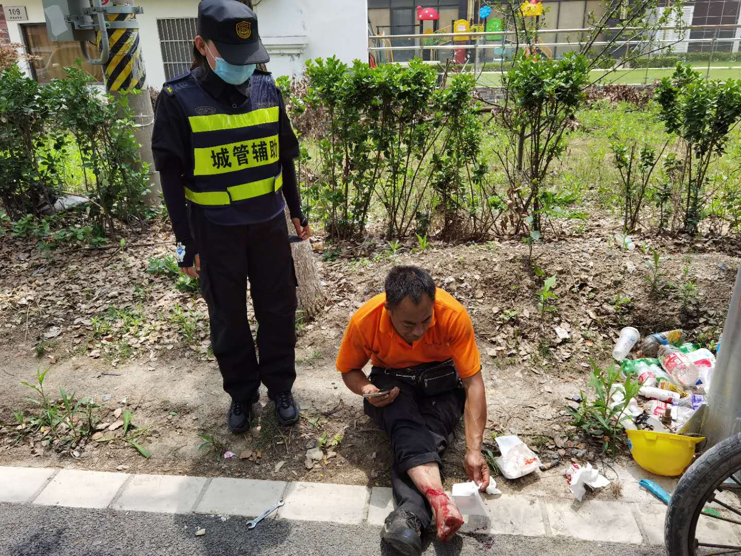 宗保公司駐周浦市容五組隊(duì)員吳吉喆剛好巡邏至此,急忙上前查看,老人身體多處受傷,且傷勢(shì)嚴(yán)重流血不止。原來(lái)是因?yàn)槿嗆?chē)搭載過(guò)重,老人力氣不足,無(wú)法控制車(chē)輛,才導(dǎo)致事故的發(fā)生。小吳把老人攙扶起身,撥打120急救電話,并緊急通知附近崗位執(zhí)勤隊(duì)員前來(lái)支援。