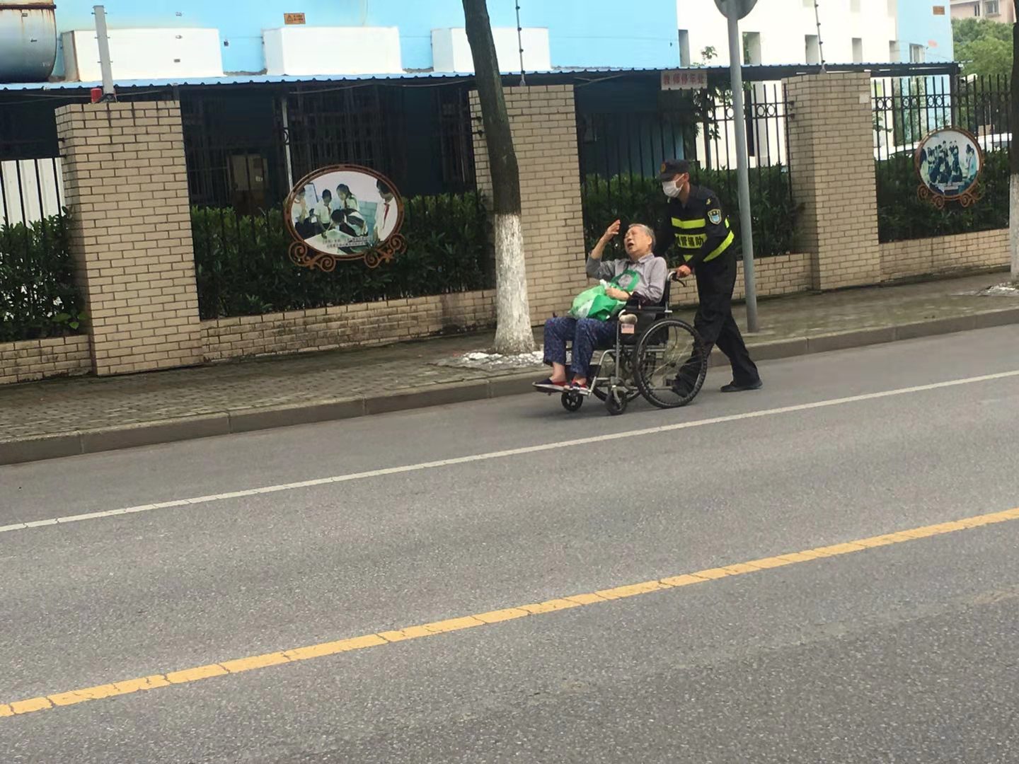張柯旋急忙上前把老人推到路邊安全的地方,詢(xún)問(wèn)老人外出有沒(méi)有家人陪同。簡(jiǎn)短溝通后得知,老人獨(dú)自一人外出,家住瑞浦路8弄。因考慮到路程較遠(yuǎn),張柯璇不放心,在向組長(zhǎng)匯報(bào)情況后,決定客串一次“輪椅代駕”護(hù)送老人回家。