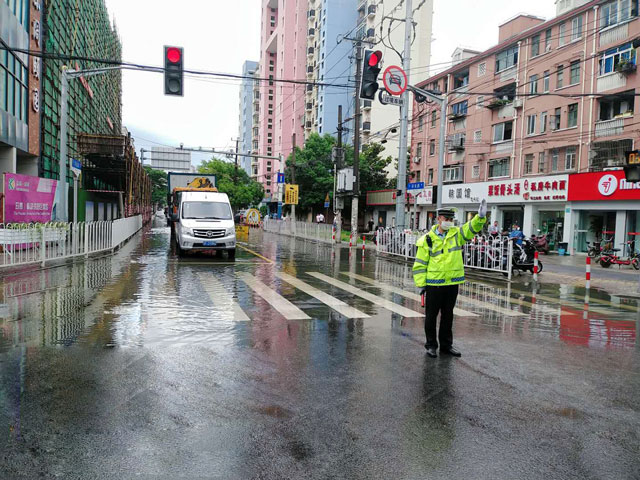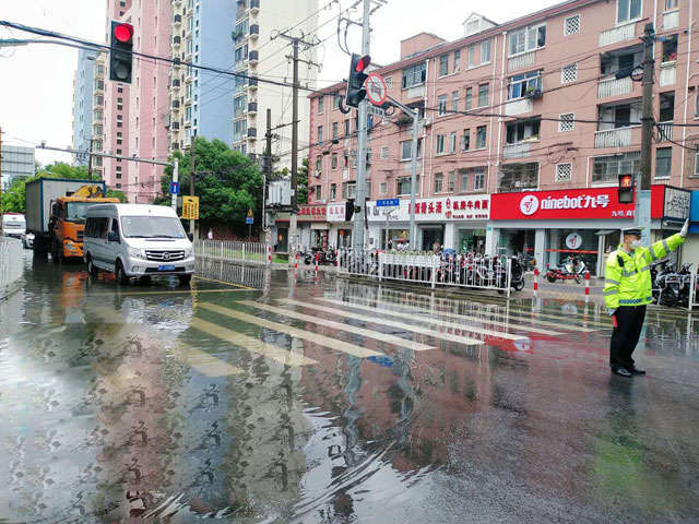 宗保公司駐莘莊梅隴交通輔警項目隊員李曉龍,暴雨中堅守崗位,不顧雨水澆身,配合交警鎮(zhèn)定指揮,疏導(dǎo)交通排堵保暢,及時引導(dǎo)車輛避免駛?cè)敕e水路段,確保了道路交通安全。