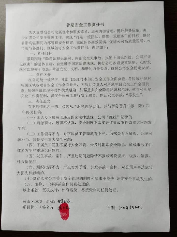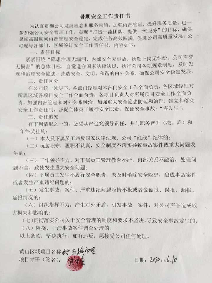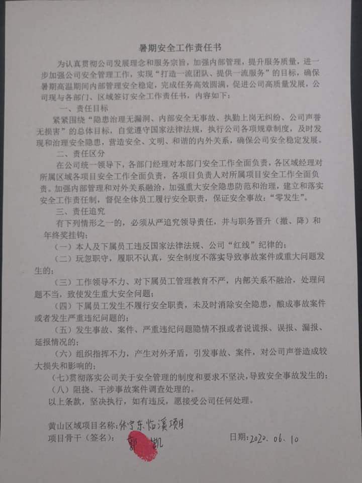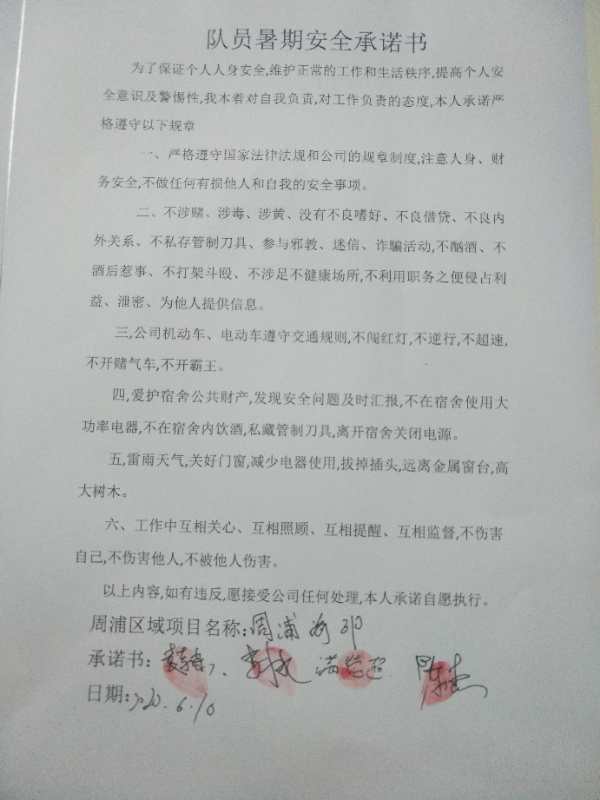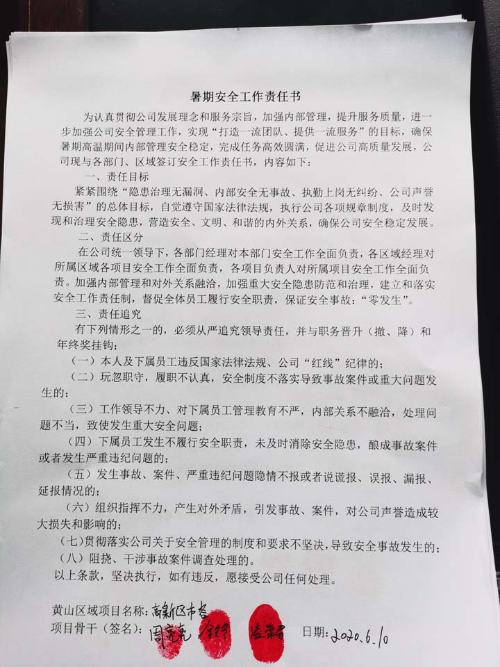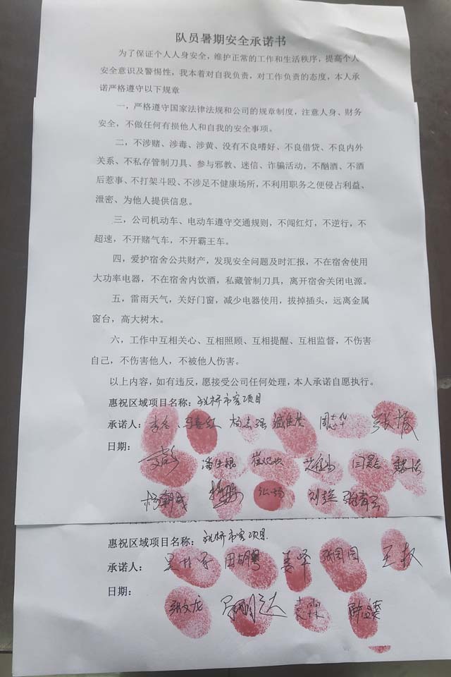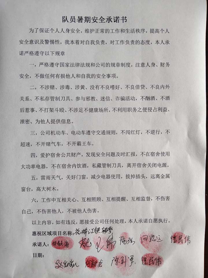 全體員工認(rèn)真學(xué)習(xí)領(lǐng)會公司暑期安全工作部署會精神,思想上高度重視,行動上堅(jiān)定自覺,各項(xiàng)目骨干帶頭與隊(duì)員簽訂暑期安全承諾書,強(qiáng)化責(zé)任意識,筑牢安全防線,堅(jiān)守安全底線,確保平穩(wěn)度夏。