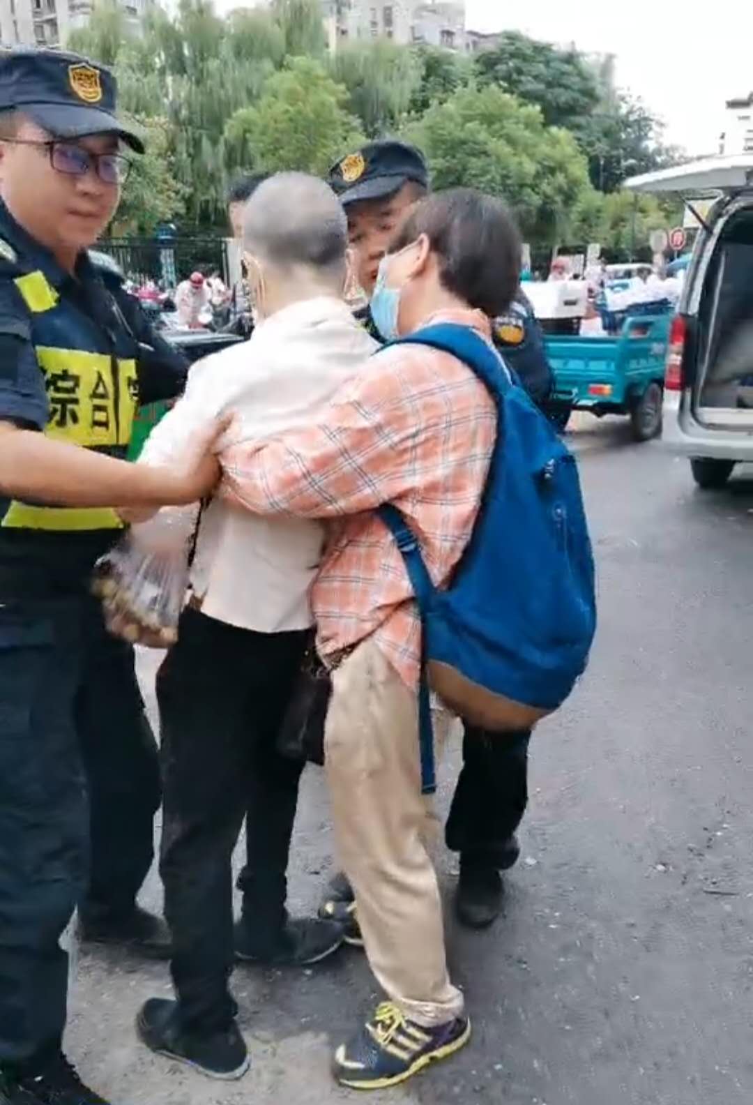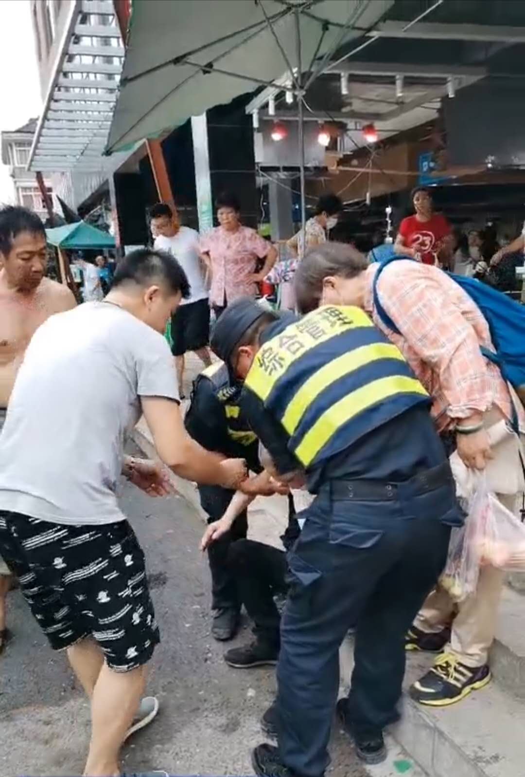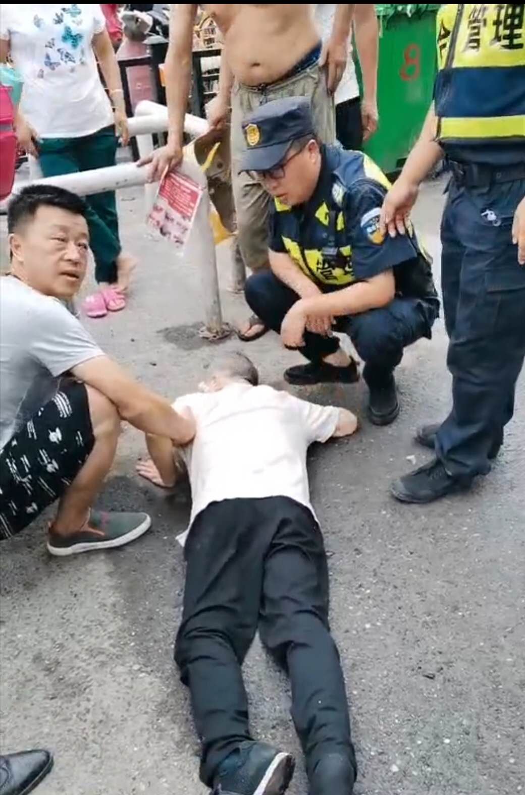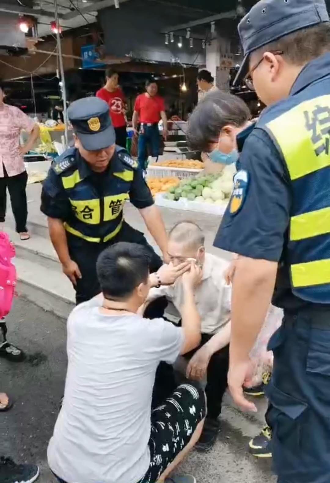 6月15日16:50,民泰公司駐金家渡菜場(chǎng)隊(duì)員宋曙光、郭永強(qiáng)、張宗豪巡邏時(shí),一位老大爺突然一個(gè)踉蹌,從臺(tái)階上臉朝下摔倒在地。