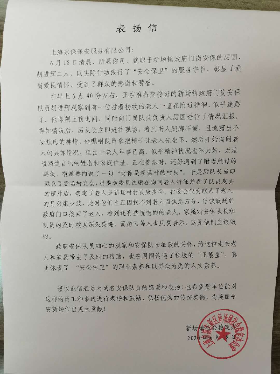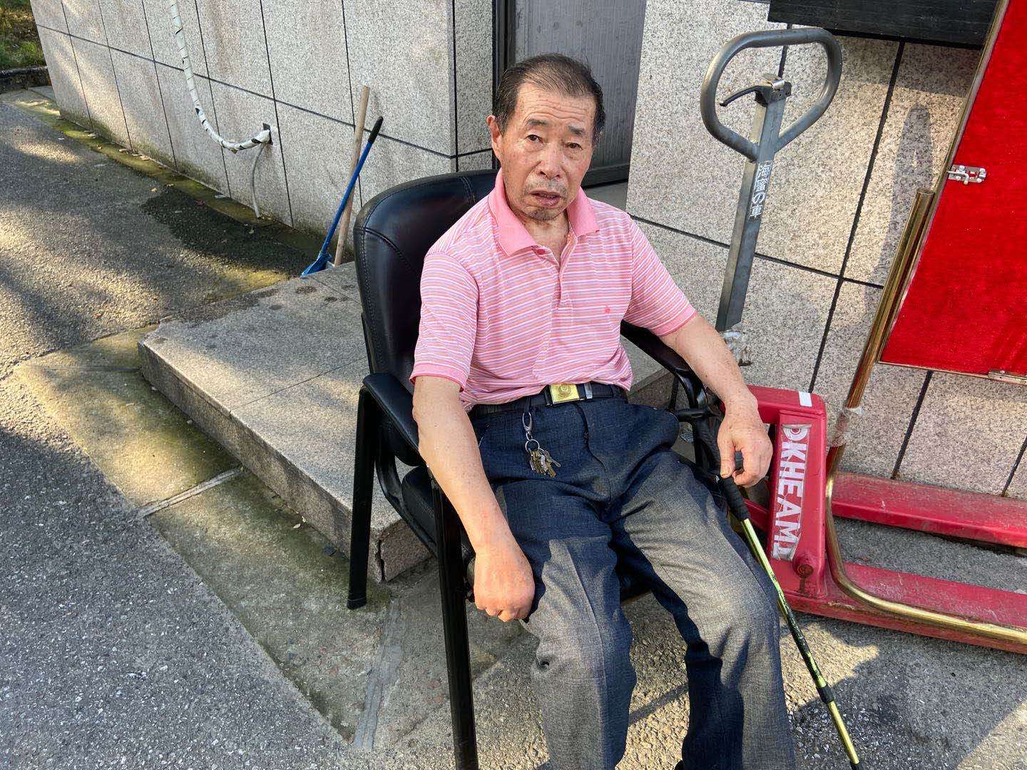 6月18日,宗保公司駐新場鎮(zhèn)政府門衛(wèi)項(xiàng)目隊(duì)員胡進(jìn)輝發(fā)現(xiàn)這一情況后,立刻通過對講機(jī)呼叫該項(xiàng)目負(fù)責(zé)人厲國。收到呼叫后,厲國立即趕往現(xiàn)場,看到老人腿腳不便,臉上流露出焦慮不安的神色,便囑咐隊(duì)員拿把椅子,倒上一杯水,先請老人坐下休息。由于老人年事已高,精神狀態(tài)欠佳,在與老人的溝通中,厲國沒有得到任何有關(guān)老人家庭狀況的信息。