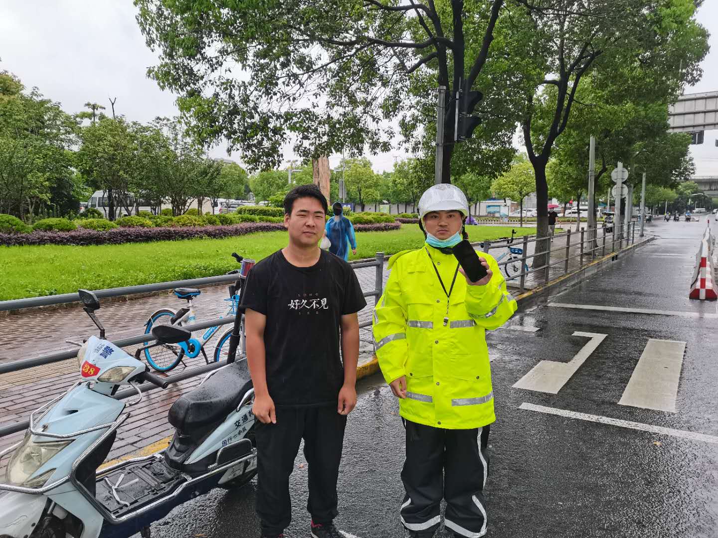 蔣虎第一時(shí)間將情況上報(bào)項(xiàng)目負(fù)責(zé)人,考慮到失主可能沒(méi)有走遠(yuǎn),得到指令后在原地等待。10分鐘后,失主打來(lái)電話,蔣虎和失主約好見(jiàn)面地點(diǎn)。沒(méi)過(guò)多久,一位身穿黑色T恤的男士急匆匆地跑過(guò)來(lái),經(jīng)核實(shí)確認(rèn)身份后,蔣虎將手機(jī)交還失主。失主當(dāng)場(chǎng)對(duì)小蔣表示感謝,并主動(dòng)要求合影。
