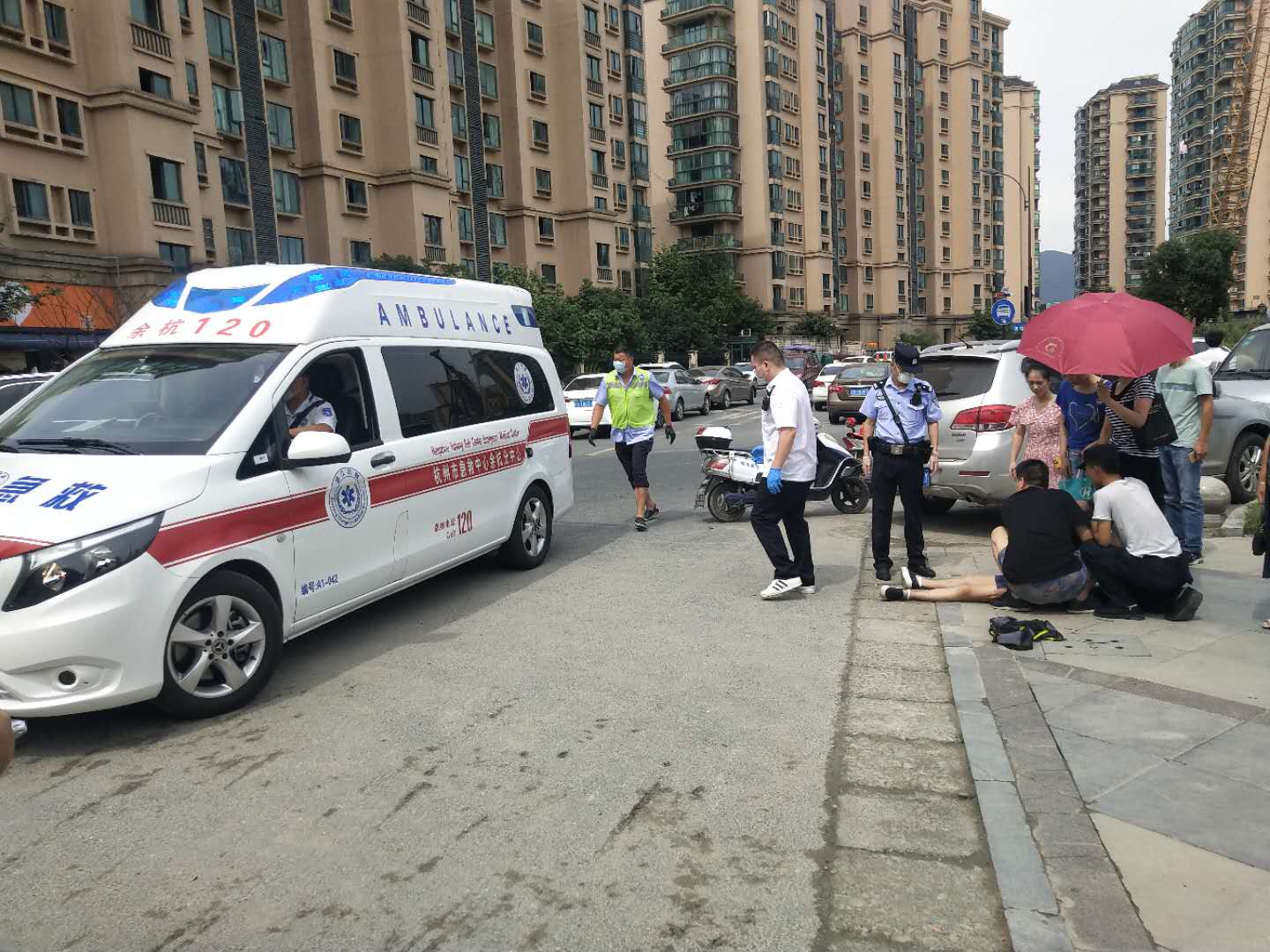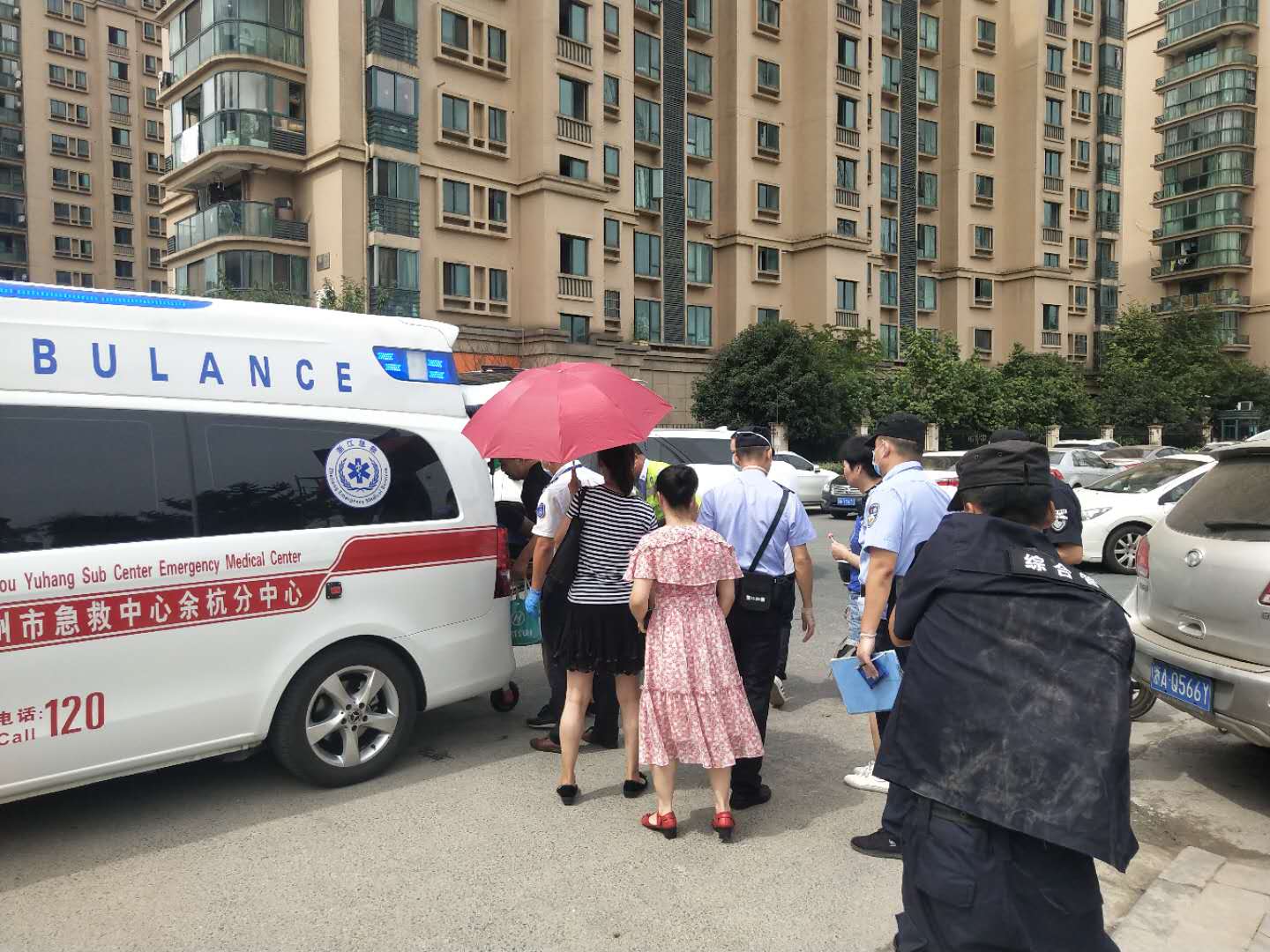 向榮立刻撥打120急救電話,同時脫下自己的外套墊在地上,讓暈倒女子平躺在地,掐她的人中并跟她保持交流,這時圍觀的市民也紛紛幫忙撐傘遮陽。