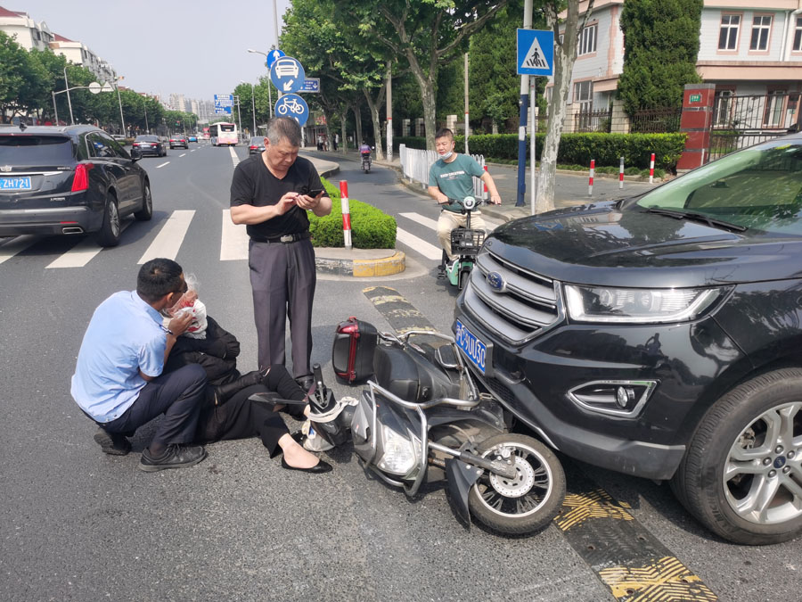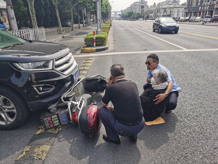 7月22日14時(shí),閔行莘莊梅隴交通輔警鄭德坡和經(jīng)理周鹍經(jīng)過(guò)春莘路時(shí),發(fā)現(xiàn)路邊發(fā)生一起交通事故。機(jī)動(dòng)車與非機(jī)動(dòng)車相撞,被撞的老人坐在地上,滿臉是血。兩人見(jiàn)狀迅速調(diào)轉(zhuǎn)車頭,將車在路邊停好后,上前查看老人受傷情況,用手機(jī)拍攝現(xiàn)場(chǎng)照片,一同指揮車輛不要妨礙交通。
