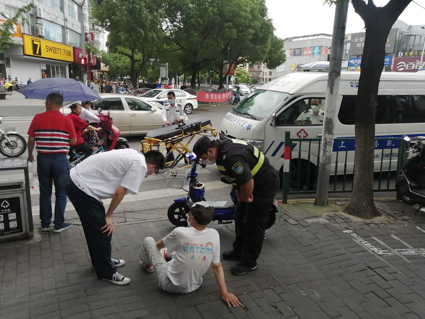 當(dāng)天15:40左右,鄭世豪和陳睿巡邏到張楊北路清溪路交叉口時(shí),看到一位老人坐在地上,一輛電瓶車(chē)倒在一旁。見(jiàn)此情景,鄭世豪和陳睿急忙跑向前,詢(xún)問(wèn)老人受傷情況。老大爺說(shuō)自己騎電瓶車(chē)避讓行人不小心摔倒了,腿上、胳膊上擦破點(diǎn)皮不要緊,就是覺(jué)得有點(diǎn)頭疼,感覺(jué)腦子有點(diǎn)迷糊。