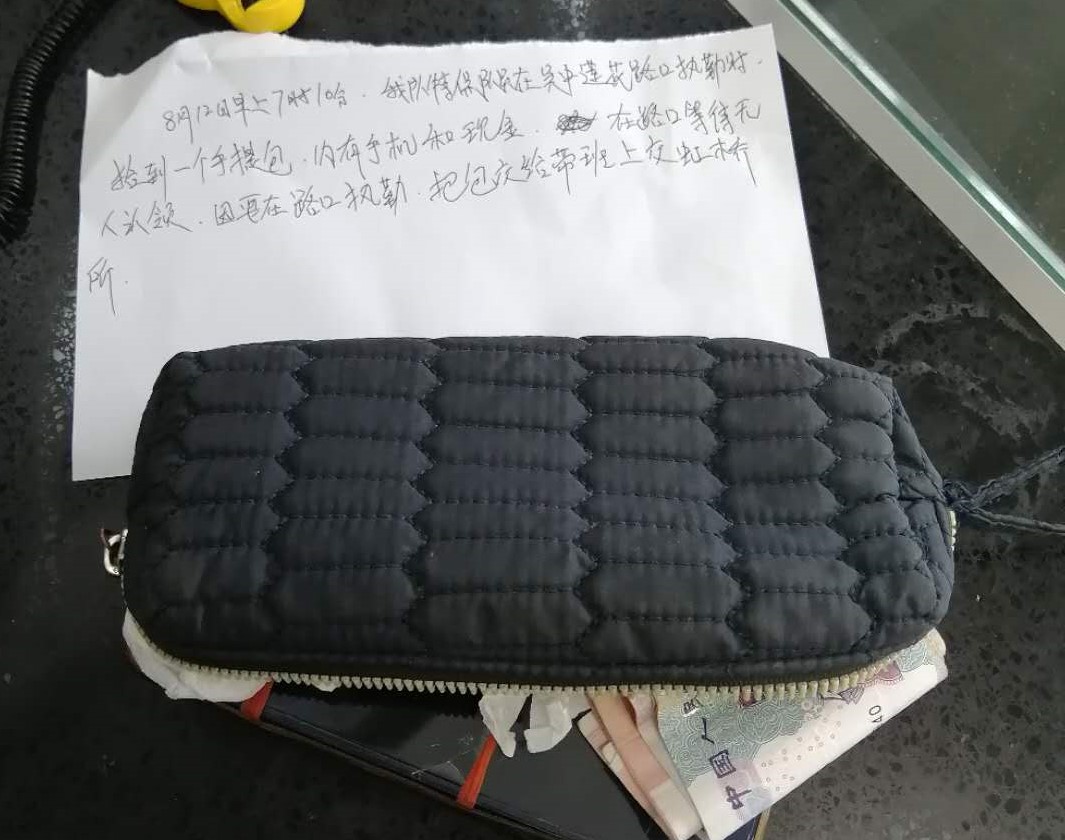 8月12日7:10,宗保公司駐閔行交通輔警項目隊員范成剛,在吳中路蓮花路路口執(zhí)勤時撿到一個手包,包內有手機、現(xiàn)金等物品。
