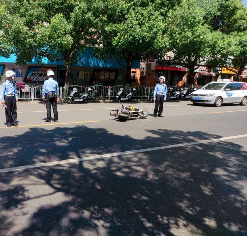 龔二龍、胡靜見狀一邊立即上報帶隊負責人,一邊疏導指揮交通。張繼則查看外賣小哥傷情,安撫其情緒,對現(xiàn)場進行拍照取證。所幸外賣小哥傷勢不嚴重。