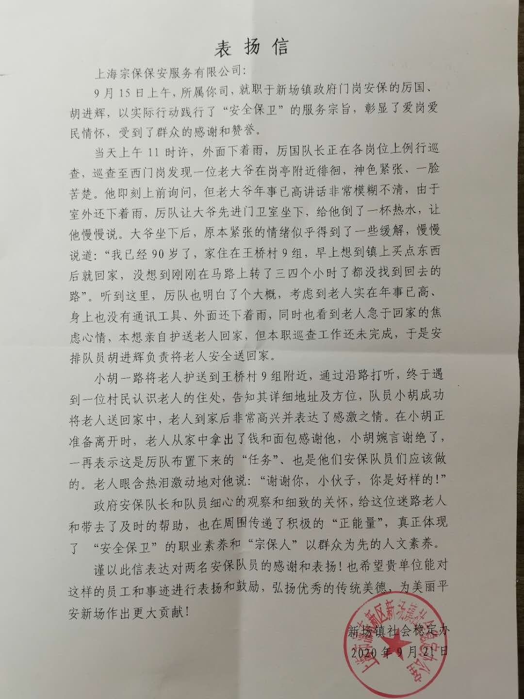 9月15日,宗保公司駐新場(chǎng)鎮(zhèn)政府門衛(wèi)項(xiàng)目隊(duì)長(zhǎng)厲國(guó)將一位迷路老人護(hù)送回家。