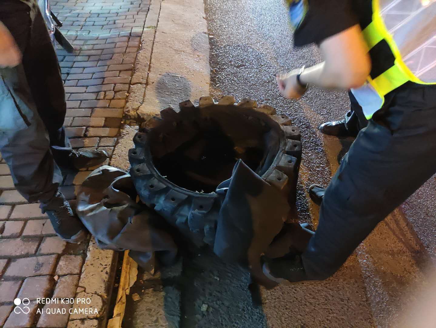 交通安全無(wú)小事 清理路障除隱患--孫橋輔警項(xiàng)目隊(duì)員清理遺落路面的壞輪胎