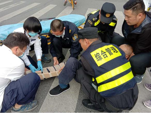 當(dāng)天下午,三林市容項(xiàng)目隊(duì)員范金元、韓佳壯、朱文輝巡邏至楊思路靈巖南路路口時(shí),發(fā)現(xiàn)現(xiàn)場(chǎng)發(fā)生交通事故,一名男子躺在機(jī)動(dòng)車道上,沒(méi)有任何反應(yīng)。