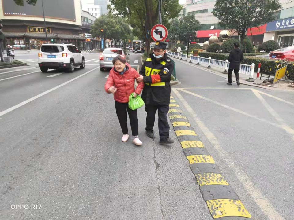 11月30日,浙江民泰保安服務(wù)有限公司駐臨平市容項(xiàng)目隊(duì)員余威幫助行走困難老人回家。