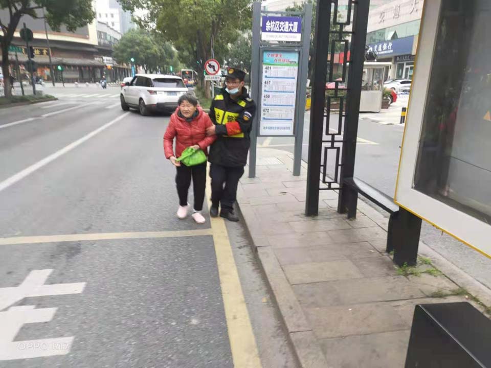 當(dāng)日15:22,余威在邱山大街和北大街交叉口胡慶余堂值勤時(shí),發(fā)現(xiàn)一位老奶奶邁著小碎步捂著肚子,艱難地行走著。余威立即上前扶住老奶奶,經(jīng)詢問得知,老奶奶去銀行領(lǐng)完養(yǎng)老金準(zhǔn)備回家,可走著走著突然覺得沒有力氣了。