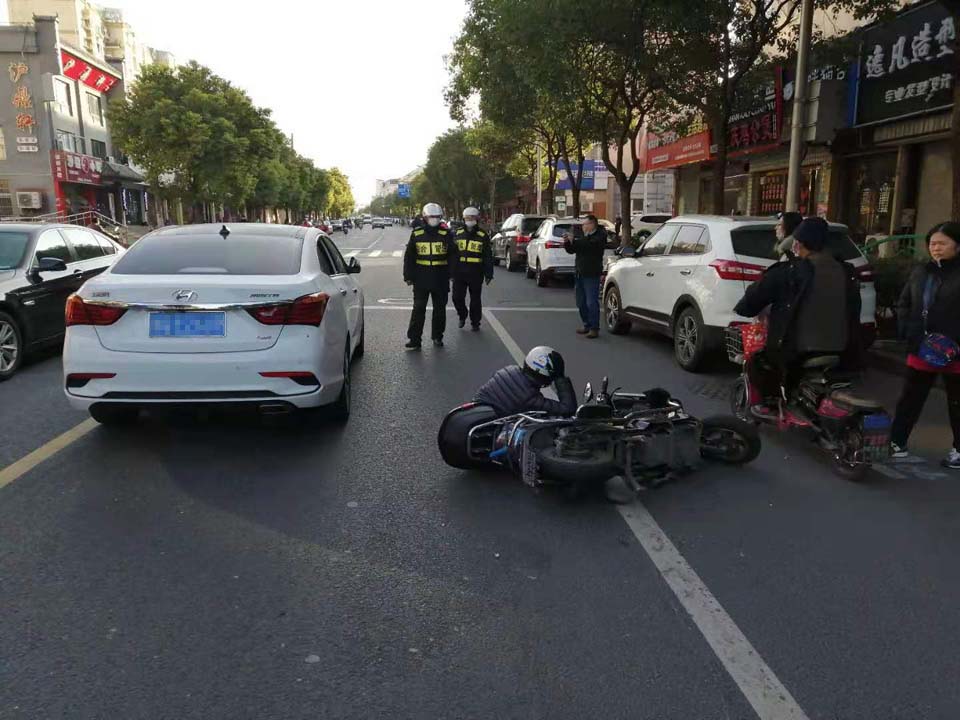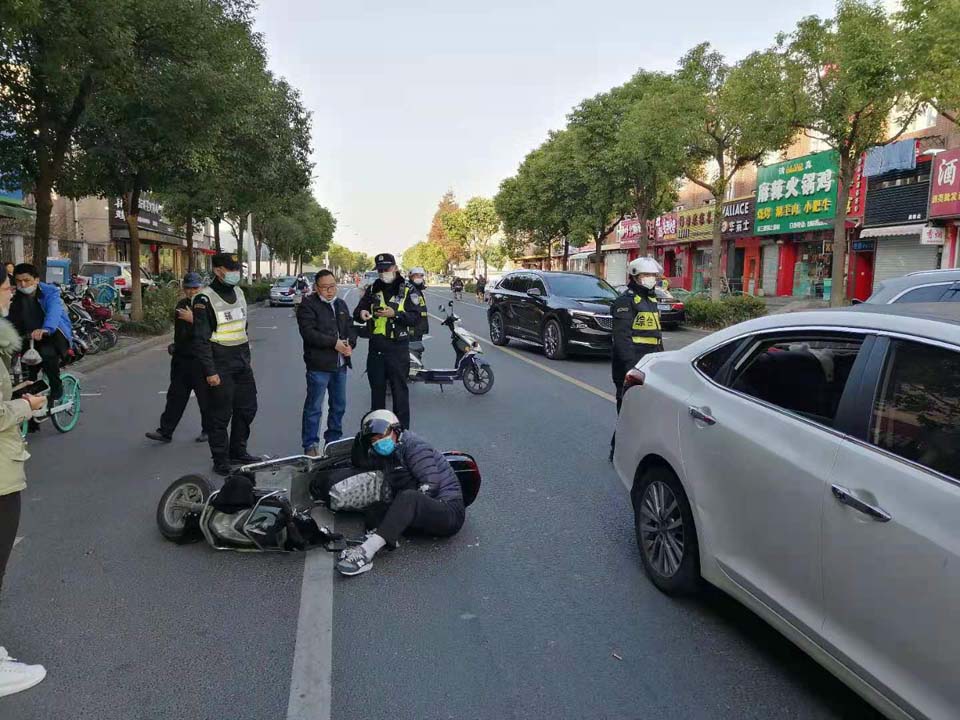 當日8:30,李旭龍、徐金雷、王剛巡邏至草高支路時,遇到一起交通事故,一輛小轎車與電動車相撞,電動車車主斜躺在路上。
